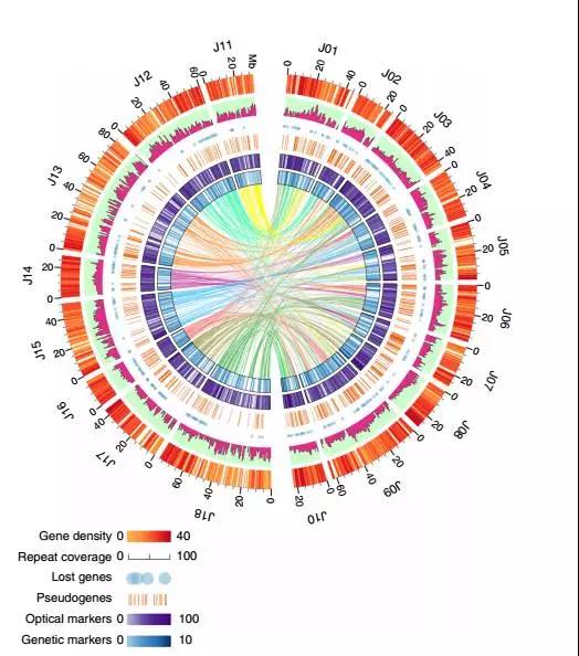 然后利用遺傳圖和光學(xué)圖譜對A、B亞基因組進(jìn)行區分,整體掛載效果非常好,A為91.48%,B為72.32%。利用光學(xué)圖譜和遺傳圖譜對基因組進(jìn)行區分,為其他多倍體物種基因組研究提供了參考。