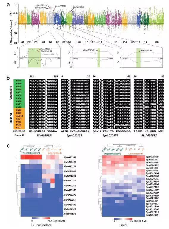 通過(guò)菜用和油用芥菜群體進(jìn)行選擇清除分析,發(fā)現dominance的基因被篩選出來(lái)的比例較高,同時(shí)結合轉錄組數據,這部分基因在油用和菜用兩個(gè)群體中差異表達。同時(shí)通過(guò)上面的分析發(fā)現與硫苷,脂類(lèi)代謝顯著(zhù)相關(guān)并且存在dominance的基因組,這些基因在油用菜用群體中有各自獨特基因分型。