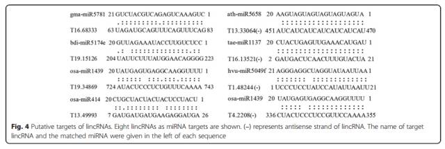 利用psRNATarget軟件及miRbase數據庫信息從DE-lincRNA中篩選miRNA的靶標,找到101個(gè)靶標lincRNA。其中有6個(gè)miRNA被本實(shí)驗室先前的small RNAseq 驗證過(guò),并且這6個(gè)miRNA是跟小麥白粉病相關(guān)的。