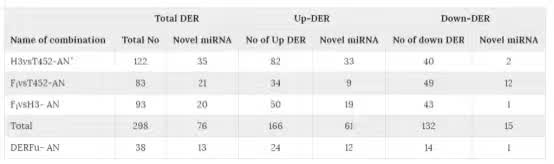 表3:花藥中的差異表達miRNA(DER)列表