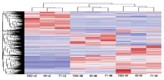 因為T(mén)452和H3的雜交F1代表現出了優(yōu)良性狀,因此可以通過(guò)轉錄組測序研究性狀差異的原因。取T452,H3及雜交F1代的三種不同組織分別進(jìn)行轉錄組測序,包括減數分裂階段的花藥、減數分裂階段的子房、開(kāi)花階段的旗葉??偣矞y了548M clean reads,平均有89.06%的reads可以比對到參考基因組上,其中93.45%都是比對到唯一位置上。三個(gè)生物學(xué)重復之間的相關(guān)性都達到了0.8以上。用qRT-PCR的方法對12個(gè)差異表達基因(DEG)的表達量進(jìn)行了驗證,結果與轉錄組測序的結果一致。對不同樣品進(jìn)行層次聚類(lèi)分析表明,相同組織的樣品總能聚到一塊(圖2)。