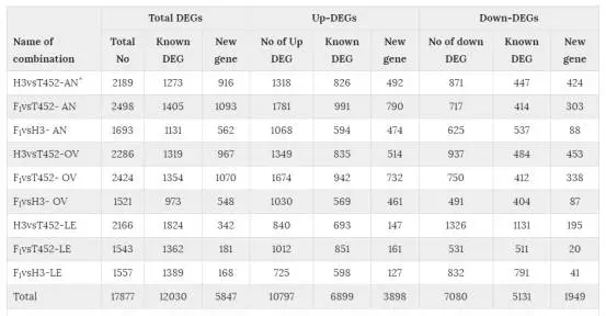 表2:三個(gè)不同組織中的差異表達基因統計。AN:花藥;OV:子房;LE:葉片。
