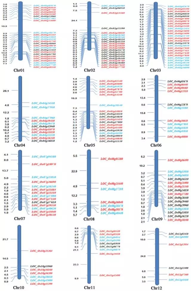 圖3:與育性和雜種優(yōu)勢相關(guān)的基因在染色體上分布。紅色為葉片中的基因,藍色為花藥中的基因,黑色為子房中的基因。