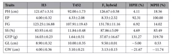 表一:T452與H3雜交F1代的雜種優(yōu)勢。HPH:高親優(yōu)勢;MPH中親優(yōu)勢;PH:植株高度;EP:?jiǎn)沃旯攘?;FG:?jiǎn)位ü攘?;SS:結實(shí)率;GYP:?jiǎn)沃戤a(chǎn)量;GL:10谷粒長(cháng)度;GW:10谷粒寬度。