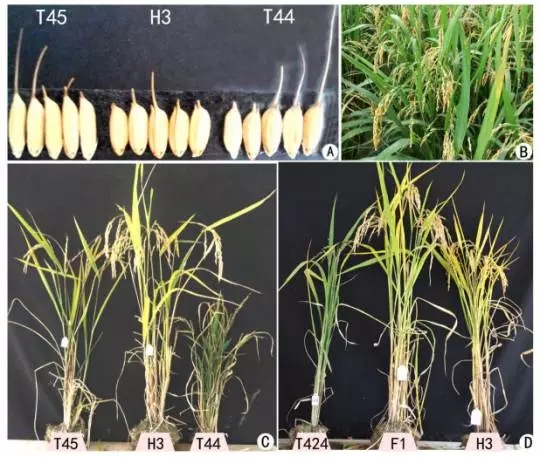 圖1:親本和雜交F1代的表型。(A)Jackson-4x(T45),Huaduo 3(H3)與96025(T44)的谷粒大小,H3是來(lái)自T45和T44的雜交;(B)H3在大田中的長(cháng)勢;(C)T45,H3,T44的植物表型;(D)Shennong15-4x(T424),H3,以及兩者雜交F1代的表型。