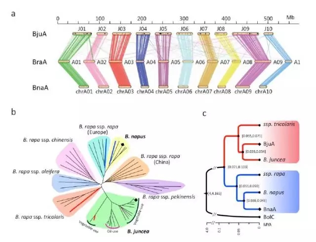 我們對10個(gè)菜用的芥菜、7個(gè)油用的芥菜,5個(gè)甘藍型油菜基因組、27個(gè)白菜基因組(多亞種)進(jìn)行了重測序分析,并繪制如上圖b中的進(jìn)化樹(shù)。從b圖中可以看到芥菜全部聚在一起,沒(méi)有出現分散的情況,說(shuō)明芥菜中A的基因組是來(lái)源于同一個(gè)亞種,屬于單系起源。