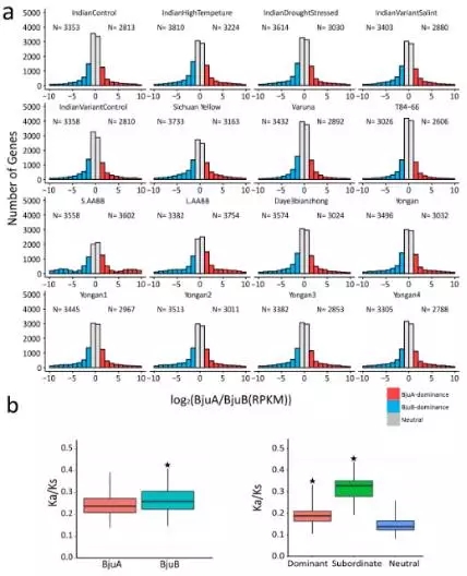由于芥菜基因組是異源四倍體,也就是說(shuō)基因組中存在兩套非常相似的亞基因組,那么在基因表達的過(guò)程中,位于兩套亞基因組上的等位基因的表達模式是怎么樣的呢,是一起表達,是相互抑制,還是一方占主導?
