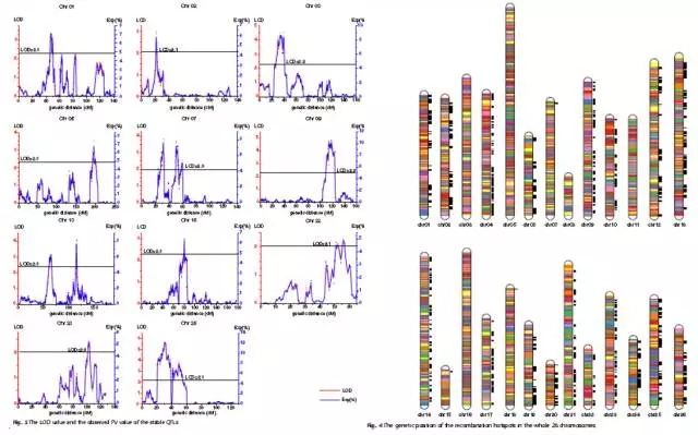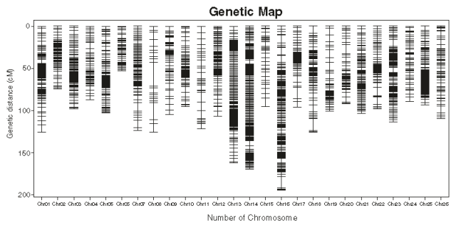 (2)重組熱點(diǎn)分析發(fā)現26條連鎖群中,21條含有重組熱點(diǎn)區域,A套中9條LG含有重組熱點(diǎn),D套中12條LG含有重組熱點(diǎn)。所有LG中,13號含有重組熱點(diǎn)最多,有196個(gè)。