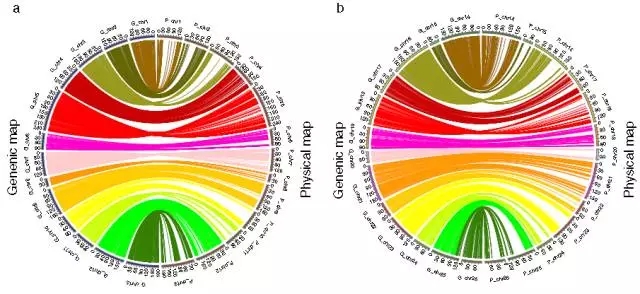 (1)遺傳圖與棉花物理圖譜共線(xiàn)性分析發(fā)現圖譜覆蓋度良好,絕大多數的SNP與物理圖譜的共線(xiàn)性良好,相對于A(yíng)基因組而言,D基因組的共線(xiàn)性更好。