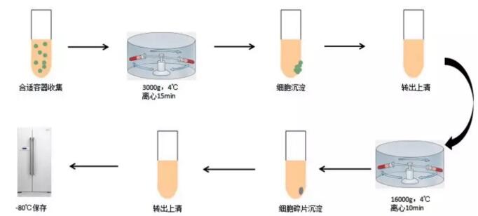 使用合適的容器收集細胞培養液或其他生物液體。3000g,4℃,離心15min。小心轉移上清液至新的無(wú)菌離心管中。將分離出的細胞上清液16000g,4℃,離心10min。槍頭不要觸碰到管底一側的雜質(zhì),小心轉移上清到新的無(wú)菌離心管中,-80℃保存。大體積干冰運輸。