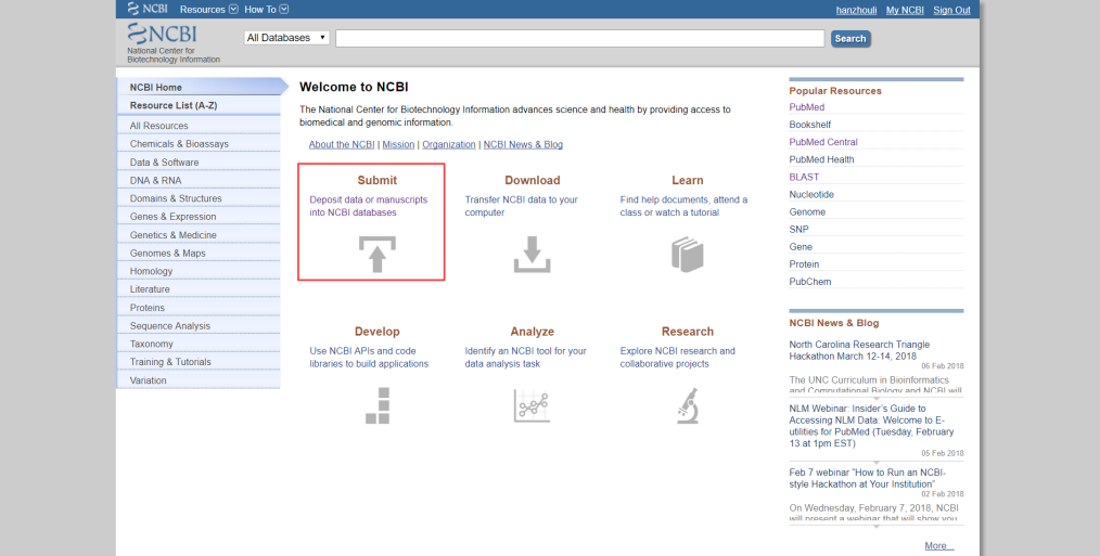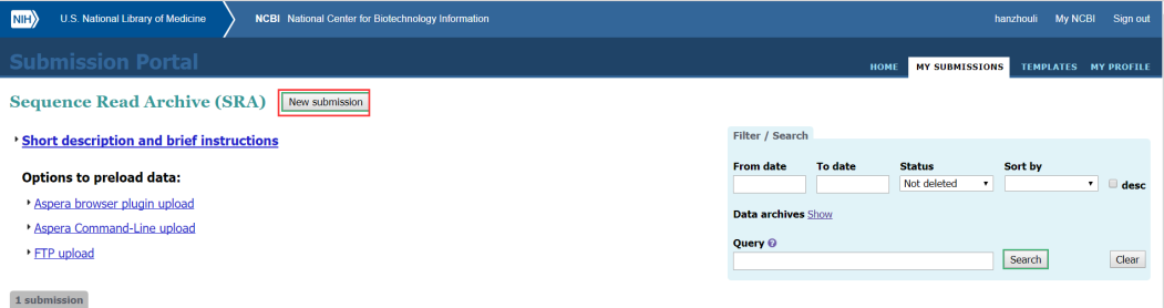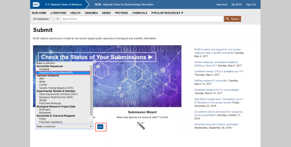 首先,登錄NCBI主頁(yè)面后點(diǎn)擊Submit進(jìn)入到數據上傳頁(yè)面,然后選擇SRA數據庫點(diǎn)擊GO按鈕后接著(zhù)點(diǎn)擊New submission(操作界面見(jiàn)下圖);