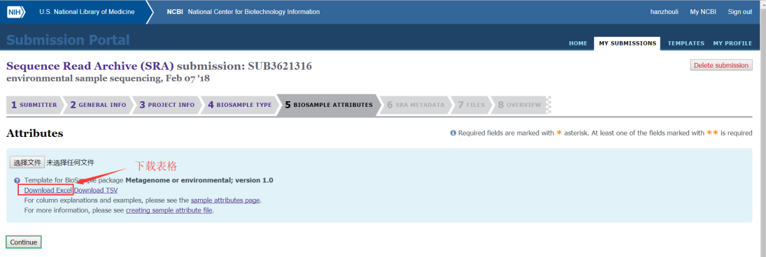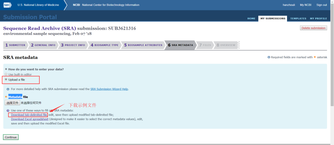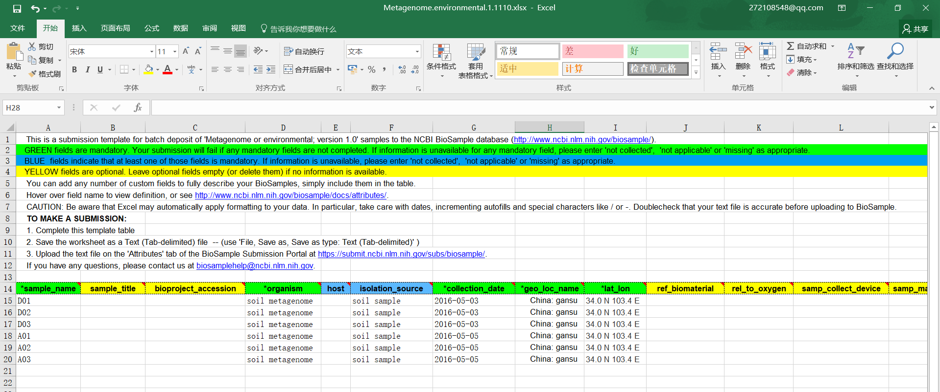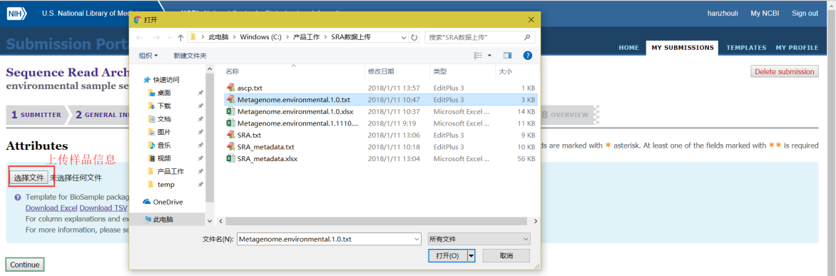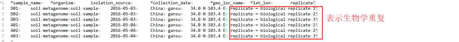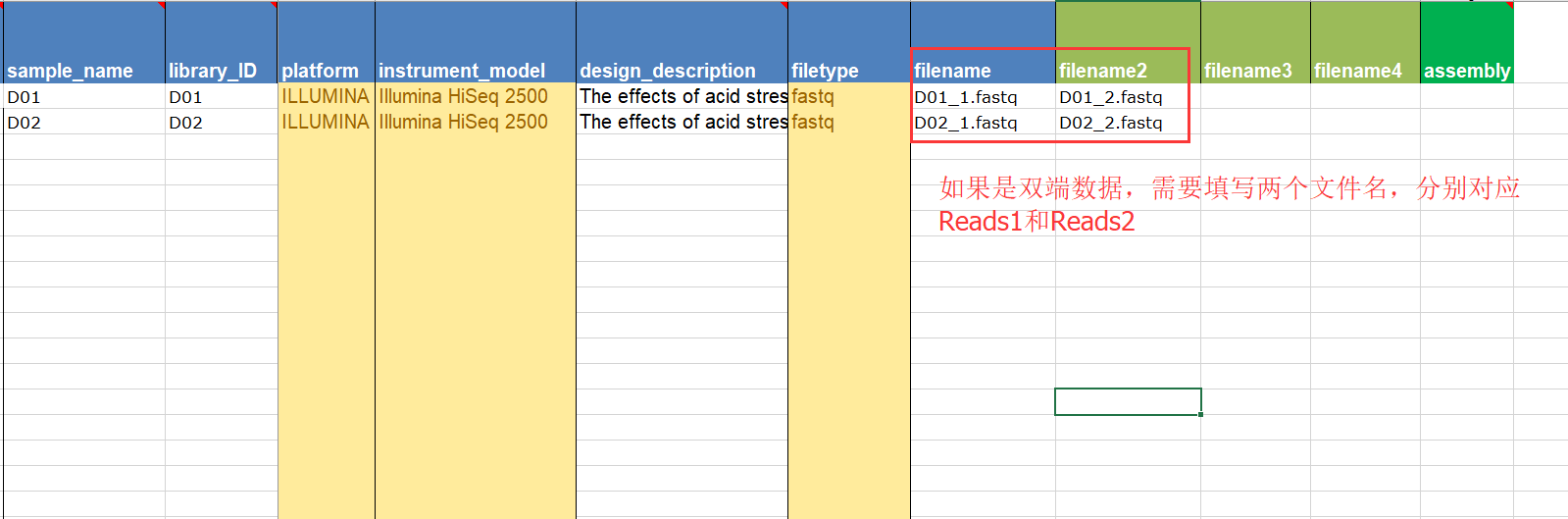 第六步:樣本具體信息,需要我們下載表格填寫(xiě),表格中綠色的為必填,藍色的需要至少填一個(gè),其它內容可以選填或者不填寫(xiě),如果是生物學(xué)重復需要添加一列replicate,填寫(xiě)完成后需要將信息粘貼到文本文件中(TXT格式),然后上傳到網(wǎng)站上;