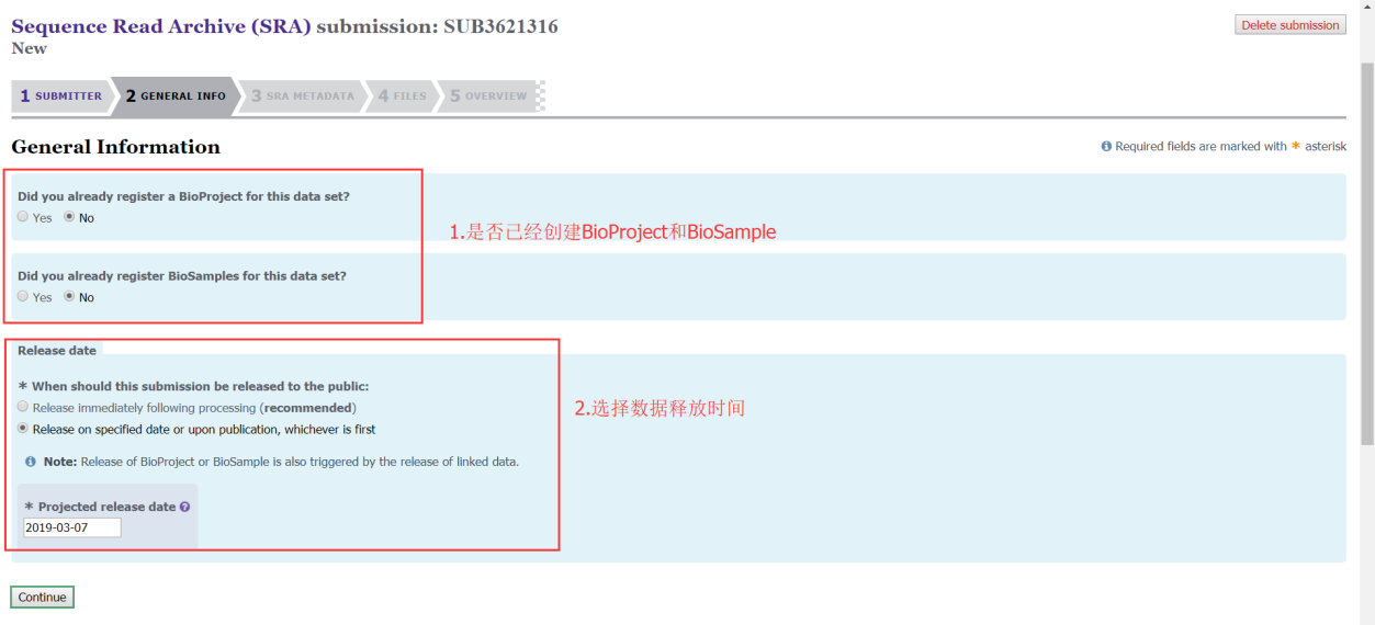 第三步:填寫(xiě)BioSample、BioProject和數據釋放時(shí)間(之前沒(méi)有創(chuàng )建BioSample、BioProject可以選擇NO);