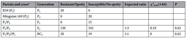 1個(gè)月后,孕穗期的親本和后代接種混合有滑石的夏孢子(urediniospore)并如上所述溫育,接種18-20d記錄侵染類(lèi)型(IT),并按前人劃分標準分為0-4。IT 0至2+的認為具有抗性,而IT3至4的則認為是易感的。