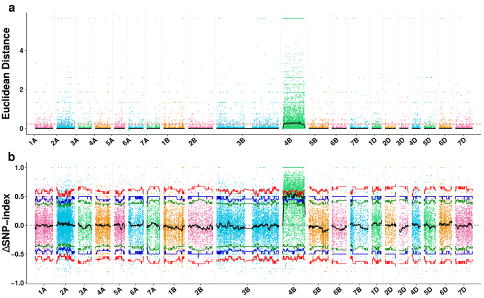 利用SNP-index和ED兩種算法,將抗病基因YrR39定位在4B染色體上17.39 Mb的區域內。(這里就不細說(shuō)了,直接上圖)