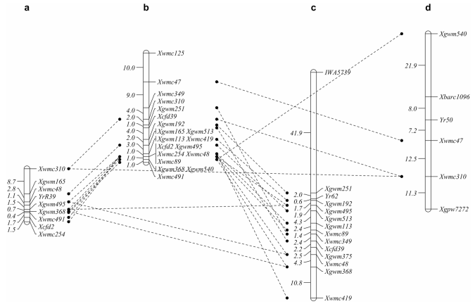 4B染色體上有83對SSR是有多態(tài)性的,但是其中只有8對能清楚的區分雙親及兩個(gè)混池。利用其對462個(gè)F2個(gè)體進(jìn)行基因分型并構建遺傳圖譜,將YrR39定位于染色體4BL 的2.6cM的區間內,其側翼標記為Xwmc495和Xwmc48(如圖3)。這與BSA分析結果一致,也驗證了SLAF-seq檢測結果的準確性。