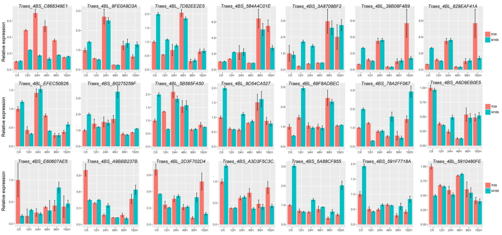 目標區域包含126個(gè)基因(表3),通過(guò)功能注釋?zhuān)业?1個(gè)與條銹病抗性相關(guān)的基因,擬定為候選基因,并進(jìn)行qRT-PCR驗證。結果表明,在病菌接種后12、24、48和96h,只有候選基因Traes_4BS_C868349E1(注釋為F-box / LRR-重復蛋白)在R39中顯示出比在銘賢169中更高的表達水平(圖4)。 這表明其可能參與了R39對條銹病的抗性。