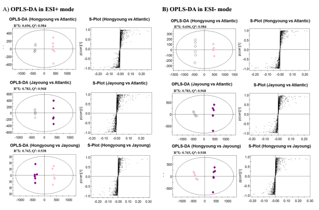 在正和負模式下的正交偏最小二乘判別分析(OPLS-DA)的分數圖和散點(diǎn)圖