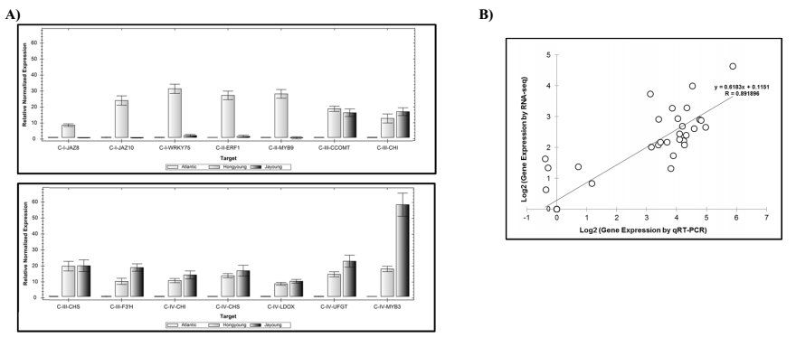 隨機挑選 14 個(gè)基因進(jìn)行 RT-RCR 驗證,結果表明 Cluster I和Cluster II 中的基因(JAZ8, JAZ10, WRKY75, ERF1 和 MYB9)在 Hongyoung 的表達量較高;ClusterIV中的基因(MYB3和UFGT)在Jayoung中表達水平較高;而 Cluster III 中的基因在 Hongyoung 和 Jayoung 中的表達水平無(wú)明顯差異。RNA-seq和RT-PCR相關(guān)性系數0.89,進(jìn)一步證明測序結果的準確性。