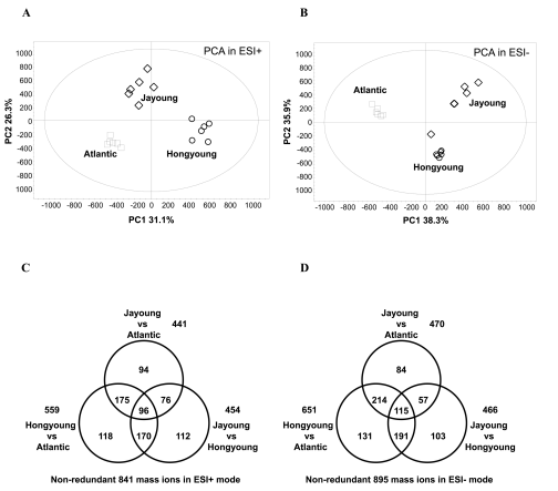 對三種不同色澤馬鈴薯樣本進(jìn)行主成分分析,結果顯示不同品種馬鈴薯代謝物差異顯著(zhù)。代謝組檢測表明,在正離子模式下,共檢測出841個(gè)信號離子,其中Hongyoung和Atlantic共有559個(gè)信號離子,Jayoung 和Atlantic 共有441個(gè)信號離子,Jayoung 和Hongyoung 共有 454 個(gè)信號離子;在負離子模式下,共檢測出895個(gè)信號離子,其中Hongyoung 和 Atlantic共有 651 個(gè)信號離子,Jayoung 和Atlantic 共有470個(gè)信號離子,Jayoung和Hongyoung共有 466 個(gè)信號離子。