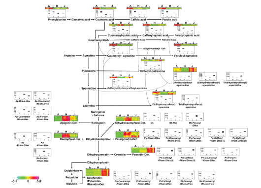 花青素是苯丙素通路中類(lèi)黃酮合成的花色素苷的?;擒?。據報道,花青素衍生物飛燕草色素(Dp),芍藥色素(Pn)和錦葵色素(Mv)是紫色和深色的色素來(lái)源,而花青色素(Cy)和花葵素(Pg)的衍生物是亮紅色果實(shí)中的主要色素。結果顯示,Hongyoung與Jayoung在苯丙素合成途徑下游的黃酮類(lèi)組分差異顯著(zhù),表明這些代謝物可能是造成馬鈴薯品種間色澤差異的關(guān)鍵因素。Hongyoung中芹黃素、山柰酚、二氫山柰酚和天竺葵色素衍生物的含量較高,而Jayoung中芍藥花青素、牽?;ㄉ?、飛燕草色素和錦葵色素衍生物積累較多。