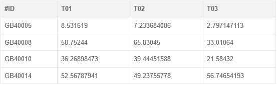 默認首行、首列為表頭,一般每列表示一個(gè)樣品,每行表示一個(gè)基因,也可統計其他含義的數據矩陣。除表頭外,參與統計繪圖的內容應為純數字,文件范例如下: