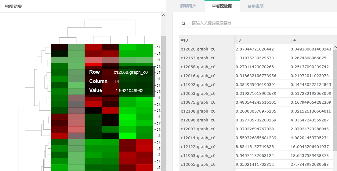 c 選中行聚類(lèi)樹(shù)某分枝后,可在“查看原數據”也篩選出對應行并下載。