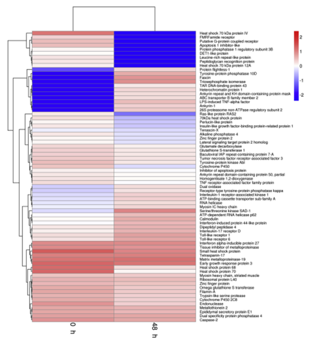 2017年,中國水產(chǎn)科學(xué)院喻達輝老師在百邁客云平臺上對合浦珠母貝免疫相關(guān)數據進(jìn)行分析,2篇文章(合浦珠母貝)先后分別發(fā)表于同一個(gè)雜志《Fish & Shell?sh Immunology》,這兩篇文章中都進(jìn)行了聚類(lèi)熱圖分析。第一篇文章中研究人員將免疫相關(guān)差異表達基因按照不同時(shí)期進(jìn)行分層聚類(lèi)分析,第二篇文章中研究人員將不同時(shí)期的unigene進(jìn)行了聚類(lèi)熱圖分析,為后續研究結果的呈現做了較好的鋪墊作用。