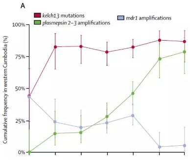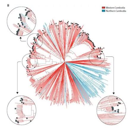 研究人員通過(guò)對來(lái)自于東南亞的1492例惡性瘧原蟲(chóng)樣本的基因組序列數據分析,其中包括2007至2013年間在柬埔寨西部收集的464個(gè)惡性瘧原蟲(chóng)樣本,耐藥性的不同流行病學(xué)起源通過(guò)對Kelch13青蒿素耐藥基因座和plasmepsin 2-3 哌喹耐藥基因座的單倍型分析進(jìn)行鑒別。最終確定了30多個(gè)獨立的青蒿素耐藥性起源,其中91%為KEL1譜系(140/154)為耐受雙氫青蒿素哌喹抗性的寄生蟲(chóng)。2008年,KEL1譜系和與哌喹抗性相關(guān)PLA1譜系相結合。2013年,KEL1/PLA1 結合譜系在柬埔寨西部頻率達到63%(24/38),并已蔓延至柬埔寨北部。