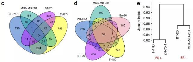 作者發(fā)現ER+乳腺癌細胞系中互作peak數目顯著(zhù)高于ER-乳腺癌細胞系,且ER+乳腺癌細胞系中存在很大一部分距離大于2Mb的互作片段。分析樣本間互作peak的Jaccard相似性,發(fā)現ER+和ER-各自組內具有更高的相似性。