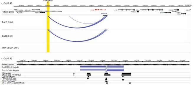 互作peak示例:下圖為10q26.13基因座的互作peak(loop),在ER+乳腺癌細胞系和正常乳腺上皮細胞系中鑒定到了互作peak,但是ER-乳腺癌細胞系中則未檢測到?;プ靼谢虻霓D錄起始位點(diǎn)(TSS)位于捕獲區域內,并且和相距幾百Kb遠的特異的HindIII酶切片段形成環(huán)(互作Peak)。在T-47D細胞系中,這些遠距離片段與DNase I超敏位點(diǎn)、CTCF、FOXA1、GATA3轉錄因子結合位點(diǎn)以及雌激素受體ERα結合位點(diǎn)共定位。