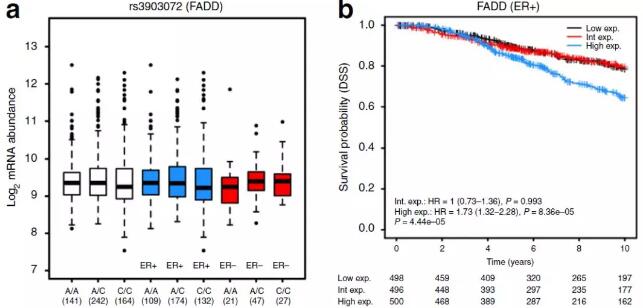 作者所納入的風(fēng)險SNP在此之前只有一個(gè)位點(diǎn)(16q12.1-rs3803662)報道了與疾病預后相關(guān)。本研究中作者直接分析了代謝型乳腺癌隊列中潛在的靶基因的表達水平與的患者預后之間的關(guān)聯(lián)(分別對ER +和ER-亞組進(jìn)行生存分析)。其中32個(gè)靶基因(33%)與ER +乳腺癌患者的DSS相關(guān),6個(gè)DSS相關(guān)的靶基因為eQTL靶基因。