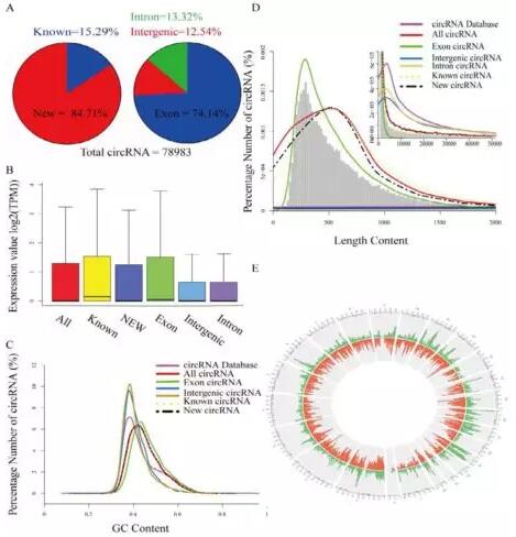 所有circRNA和外顯子circRNA的GC含量高于circRNA數據庫,但內含子和基因間區circRNA的GC含量與circRNA數據庫中相似(圖2c)。此外,circRNA長(cháng)度的峰值主要集中在558 bp區域,而在數據庫中circRNA的峰值則集中在4105 bp區域。新circRNA與已知的circRNA長(cháng)度具有相似的特征,表明新circRNA數據是可靠的(圖2d)。圖2e顯示了circRNA在人類(lèi)染色體上的基因分布,circRNA也廣泛分布于所有的染色體中,但在Y染色體和著(zhù)絲粒上的分布較少,在每條染色體的染色體臂兩端有較高的分布。