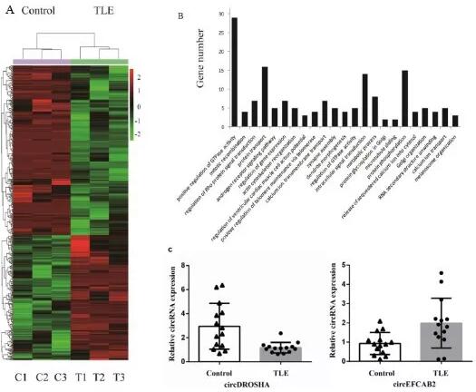在本研究中,為了評估circRNA在人體內的作用,作者采用了高通量測序方法,測定TLE患者和非TLE患者顳葉新皮質(zhì)中circRNA表達水平,并對環(huán)狀RNA的功能進(jìn)行了注釋。作者描述了一個(gè)包含潛在基因與circRNA-miRNA的網(wǎng)絡(luò )。