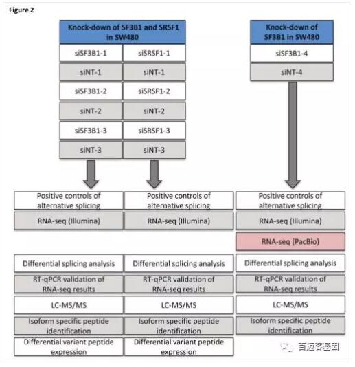 為了測試splicify這種蛋白組學(xué)數據的分析方法,建立了一種可以對isoform變化進(jìn)行調控的實(shí)驗模型,對SW480結腸癌細胞系中的剪接因子SF3B1和SRSF1進(jìn)行siRNA干擾以下調其表達,然后通過(guò)RNA-seq和質(zhì)譜進(jìn)行結果檢測。