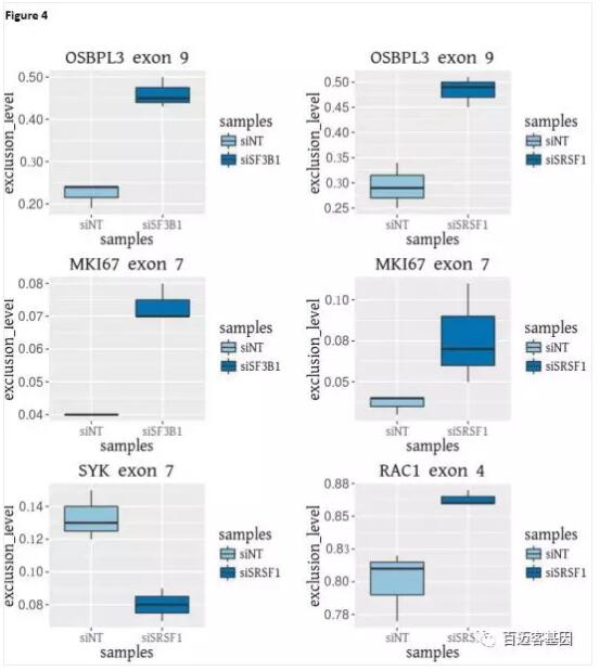 為了進(jìn)一步驗證,作者選擇了4個(gè)外顯子跳躍事件進(jìn)行RT-qPCR驗證,包括SYK exon 7, RAC1 exon 4, OSBPL3 exon 9, MKI67 exon 7(如圖4所示)。根據RNA-seq分析,所有的事件在SRSF1下調后都發(fā)生了差異剪接,而OSBPL3和MKI67則受SF3B1下調的影響。