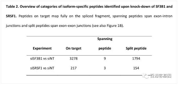 肽段數量上的差別直接和兩個(gè)實(shí)驗剪接isoform數據庫的數目相關(guān)??偟膩?lái)說(shuō),大約60%的isoform特異肽段會(huì )比對到目標區域,跨越exon-econ junction的split 肽段約占40%,跨越 exon-intron junctions 的spanning肽段則很少被發(fā)現(如表2所示)。
