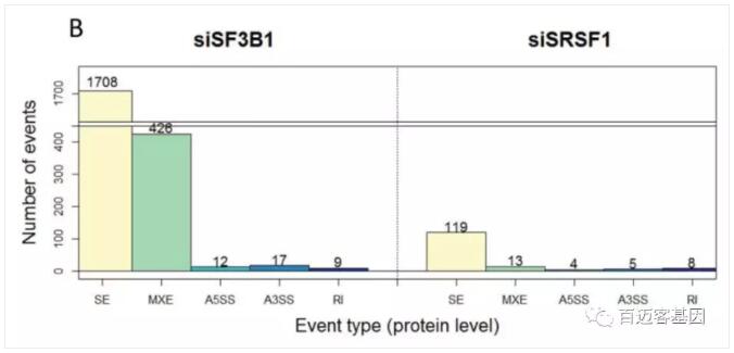 平均15%的剪接事件的肽段在屬于同一事件的inclusion和exclusion isoform中被觀(guān)察到。大多數的isoform都被認為是基于Swissprot規范序列數據庫的標準蛋白質(zhì)。大約5%和25%的鑒定isoform被歸類(lèi)為siSF3B1和siSRSF1的非標準亞型。肽段的一個(gè)子集比對到兩個(gè)或更多的isoform,通常是由于不同的isoform之間的重疊的外顯子導致的。相比于exclusion isoform,由于inclusion isoform的序列較長(cháng),因此確認率更高。在被確定的isoforms中,所有類(lèi)別的選擇性剪接事件都有所涉及,與RNA水平上的結果一致,外顯子跳躍事件占的比例最大。從RNA和蛋白水平上剪接事件數目的比例看,互斥外顯子更常被檢測到(如圖3B所示)。