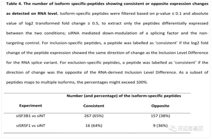 通過(guò)對剪接特異肽段進(jìn)行差異表達分析,揭示了這些肽的子集在實(shí)驗組和對照組之間有顯著(zhù)差異,指出了mRNA基因組和蛋白質(zhì)組結果之間的一致性事件(如表4所示)。