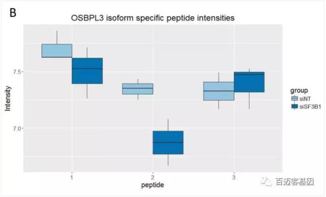 約65%的顯著(zhù)差異表達的splice-specific-peptides在RNA水平上表現出一致的表達差異。例如,下調SF3B1的實(shí)驗組中,OSBPL3 9號外顯子中分別有3個(gè)支持外顯子保留和1個(gè)支持外顯子去除的peptides被鑒定出來(lái)。兩種inclusion specific-peptides表達明顯較低,而exclusion specific -peptides則與對照相比表現出較高的表達量(如圖5所示)。