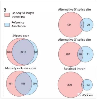 在研究可變剪接方面,Iso-Seq測到的全長(cháng)轉錄本對基因組注釋結果是一個(gè)極大補充,尤其在內含子保留、3 ‘可變剪接和5 ‘端可變剪接事件中,Iso-Seq測到的全長(cháng)轉錄本與基因組注釋的重疊較小。這表明,基因組注釋中缺少一些完整的或部分的內含子序列可變剪接的isoform形式。