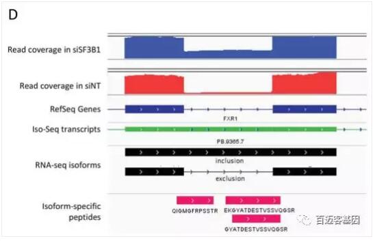 例如,全長(cháng)轉錄本進(jìn)行測序結果支持FXR1內含子保留的三種肽段,因此這種內含子保留事件也存在于注釋文件中。Illumina 測到的短 reads支持這一事件,并提供了定量的證據,表明它在SF3B1的下調過(guò)程中比其對照組(圖6D)更高表達。