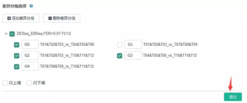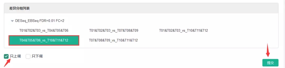 登錄百邁客云(www.biocloud.net)——進(jìn)入相應項目【報告】——差異基因挖掘—差異表達基因集查詢(xún)——點(diǎn)擊相應差異分組并選擇“只上調/只下調”,最后點(diǎn)擊“提交”。