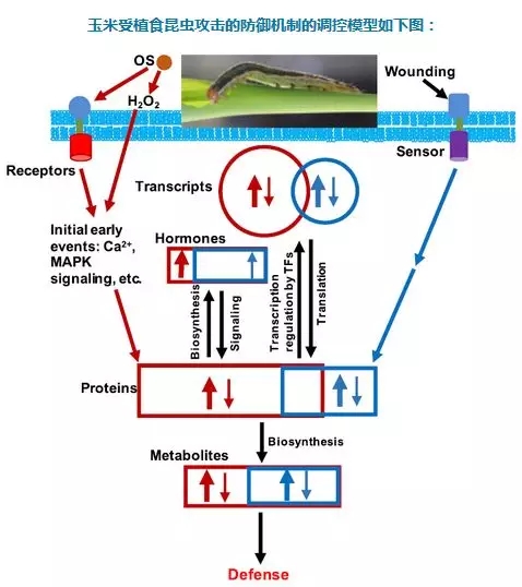 Qi J[4]等,利用多組學(xué)(轉錄組學(xué)、蛋白組學(xué)、代謝組學(xué))技術(shù),探索了玉米受植食昆蟲(chóng)攻擊的防御機制,并構建繪制了系統的調控模型。這些數據對玉米防御昆蟲(chóng)災害的進(jìn)一步遺傳學(xué)研究搭建了很好的框架,也為抗昆蟲(chóng)災害的玉米新品種的培育奠定了良好的基礎。