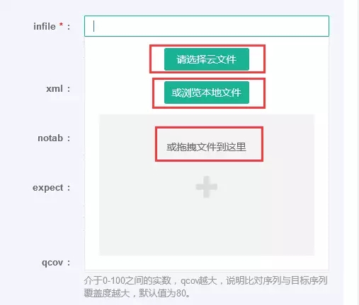 infile :在輸入比對的序列文件時(shí),有三種方式,包括選擇云文件、瀏覽本地文件或拖拽文件