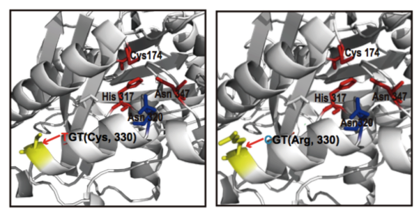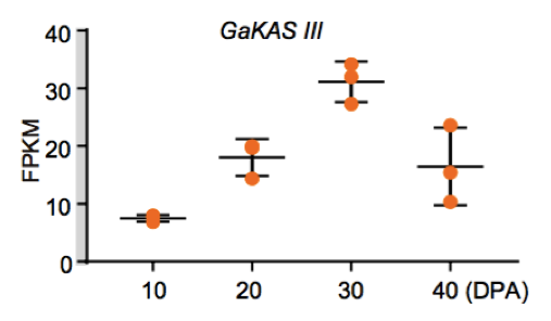 (1)脂肪酸含量相關(guān)基因的定位與研究 棉花是世界上第六大植物油來(lái)源,通過(guò)GWAS關(guān)聯(lián)分析,在11號染色體上的GaKASIII基因組座位上(Ga11G3851)的第8個(gè)外顯子區獲得了1個(gè)顯著(zhù)的SNP位點(diǎn),該基因編碼3-Oxoacyl-[acyl-carrier-protein ACP] synthase III(3-氧?;?[酰載體蛋白]合酶III),如圖8 a-c,KASIII基因編碼的這一關(guān)鍵酶可以使得脂肪酸鏈從C2到C4延伸,并最終確定種子中棕櫚酸(C16:0)和棕櫚油酸(C16:1)的組成。GaKASIII基因的多態(tài)性導致了保守的ACP_synthase_III_(酰載體蛋白合酶III)結構域中半胱氨酸/精氨酸間的置換(圖8 c),單倍型B(TGT,Cys)主要出現在低含油量種質(zhì)中,而在高含油量種質(zhì)中發(fā)現單倍型A(CGT,Arg)(圖8 d-e)。GaKASIII基因在開(kāi)花后(DPA)的30天表達量最高(圖9),這是種子油量積累的關(guān)鍵階段,在單倍型種質(zhì)A中,C16:0和C16:1含量以顯著(zhù)的速率累積(圖10);蛋白質(zhì)結構模型預測顯示,半胱氨酸/精氨酸殘基位于α螺旋處,該位點(diǎn)靠近酶活性位點(diǎn),同時(shí)是輔酶A(CoA)結合位點(diǎn)(圖11)。