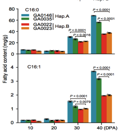 圖10 在棉花生長(cháng)發(fā)育過(guò)程中C16:0和C16:1脂肪酸含量分析(Hap. A和Hap. B)