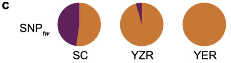人工選擇在農作物的馴化和遷徙的過(guò)程中具有重要的作用。群體結構分析顯示當K=4時(shí),YER與SC和YZR明顯不同(圖4 b,K=4)。通過(guò)兩兩群體間(SC vs. YZR, SC vs. YER, YZR vs. YER)的選擇性清除分析(FST)鑒定出了分別覆蓋到3,162,2,879和3,308個(gè)基因上的59,53和51個(gè)顯著(zhù)遺傳分化的區域。SC和YZR之間的21個(gè)分化的區域(約43.5 Mb 含有915個(gè)基因)在群體SC和YER之間是保守的(圖7 a)。