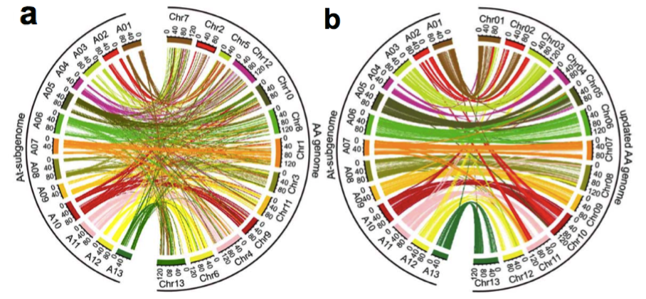 a. 亞洲棉原基因組與陸地棉基因組共線(xiàn)性分析;b. 亞洲棉更新基因組與陸地棉基因組共線(xiàn)性分析