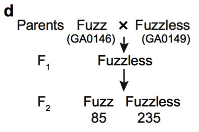 (3)與棉絨相關(guān)基因的研究 棉絨是覆蓋種子表面的短纖維。研究中選擇了亞洲棉種質(zhì)中的158份有絨毛和57份無(wú)絨毛材料進(jìn)行GWAS關(guān)聯(lián)分析,最終在8號染色體上(?0.6 Mb至?1.3 Mb的區間內)獲得了強烈的關(guān)聯(lián)信號(圖17 a-b)。QTL分析也同樣定位到8號染色體上(圖17 c)。通過(guò)有絨毛品系(GA0146)和無(wú)絨毛品系(GA0149)雜交獲得的F2代顯示了有絨毛和無(wú)絨毛的表型分離比為1:3(圖17 d),說(shuō)明了棉絨的生長(cháng)是由單基因座控制。研究中進(jìn)而放大了QTL和GWAS的重疊區,發(fā)現了這個(gè)大約600 kb的區域包含推測的10個(gè)蛋白編碼基因(圖17 e)。在這一強烈的信號區域(-logP = 18.95)下或附近,發(fā)現了4個(gè)凱氏帶膜蛋白基因(casparian strip membrane protein genes)。在B-型細胞周期蛋白上游獲得了1個(gè)信號,而B(niǎo)-型細胞周期蛋白之前被報道過(guò)與毛狀體和纖維發(fā)育有關(guān)。